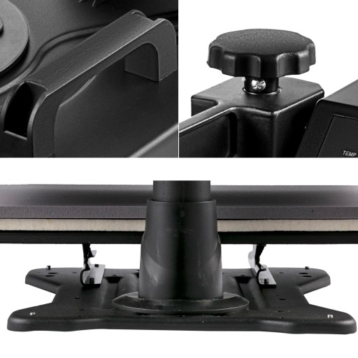 Przenośny uchwyt może ułatwić ruch. Elastyczny przycisk ułatwia regulację wysokości. Oparta na solidnej podstawie prasa termiczna wymaga stabilnego podparcia, aby utrzymać płynną pracę.