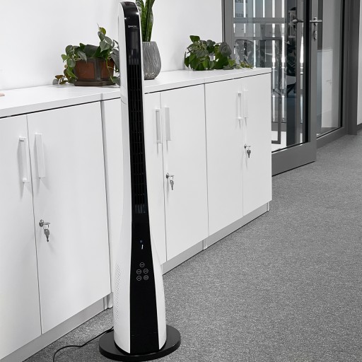 Wentylator kolumnowy zamiast klasycznego wiatraka został wyposażony w wentylator turbinowy, który dmucha na całej wysokości wentylatora.