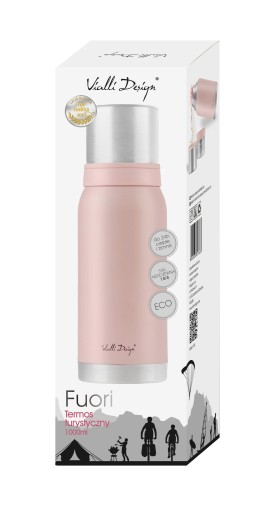 Termos turystyczny Fuori dostępny jest w pięciu wariantach kolorystycznych. Możemy wybierać pomiędzy białym, różowym, granatowym, zielonym i grafitowym. Produkt wyróżnia się nowoczesnym designem, wygodnym kształtem oraz stuprocentową szczelnością – takie połączenie to gwarancja zadowolenia każdego klienta. Termos firmy Vialli Design został dodatkowo zaopatrzony w dwa kubki o pojemności 150 ml i 200 ml.