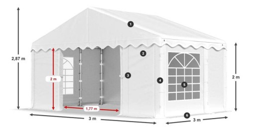 1 - Dach PE (polietylen) 240g/m2 2 - Brama typu kurtyna 3 - Mocne zamki YKK przy wjazdach 4 - Wymienne maskownice 5 - Ściany boczne PE ok. 2 x 2 m (polietylen) 240g/m2 - Okna witrażowe 140 x 130 cm 6 - Oczka mocujące plandekę