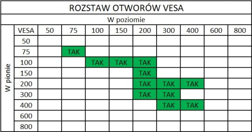 Zastosowany najbardziej popularny standard VESA sprawia, że możemy zainstalować praktycznie każdy telewizor wyposażony w otwory o rozstawie 75 x 75, 100 x 100, 150 x 100, 200 x 100, 200 x 150, 200 x 200, 200 x 300, 300 x 200, 300 x 300, 300 x 400, 400 x 200, 400 x 400 i wadze nie przekraczającej 35kg.
