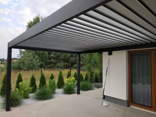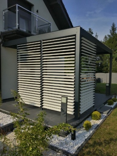 TWIGO SOL - pergola tarasowa aluminiowo-stalowa z manualnie otwieranym dachem w postaci obracanych lameli dachowych. Szeroki 11 cm profil!