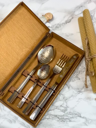 Oferujemy elegancki zestaw sztućców z grawerem według waszych wytycznych.