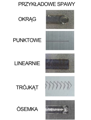 - Głowica spawalnicza o dużej mocy pozwala na wiele typów prowadzenia wiązki: ○,―,•, ꓷ, 0, ▲, 8 ;