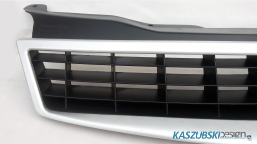 Grill ładnym, ale posiada jakieś małe defekciki. Ramka grilla w szaro-srebrna (na zdjęciach wyszła biała), ale raczej do odświeżenia, ponieważ posiada rysy. Górne mocowania kompletne, ale prawe (od pasażera) jest delikatnie nadpęknięte (zaznaczone na zdjęciu czerwoną strzałką) - trzyma się, ale wypadałoby je podkleić/pospawać. Emblemat 'autko' oryginalny. Dolne mocowania (oryginalne, tak właśnie Irmscher zaprojektował te atrapy - najpierw mocowania były montowane w zderzak, na nie trzeba było nałożyć klej/silikon i dopiero dołożyć atrapę) przyklejone, nie trzeba już nic spasować, wystarczy zamontować w aucie.