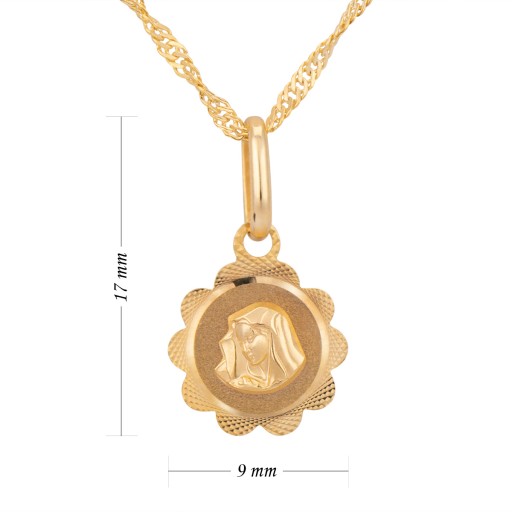 - Złoty medalik w kształcie kwiatuszka z wizerunkiem Matki Boskiej