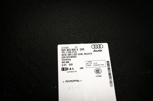 Przedmiotem sprzedaży jest prawy boczek tapicerki bagażnika do Audi A3/S3 8V Sedan