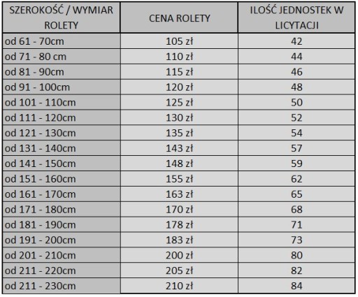 Tabela cenowa oraz ilość jednostek potrzebnych do zakupienia danego rozmiaru rolety.