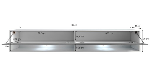 Lowboard A 180cm to prosta, a zarazem stylowa szafka RTV, która ozdobi Twój salon. Oświetlenie LED square jeszcze bardziej podkreśli piękno mebla, a zamykane jak i otwarte półki sprawiają, że szafka staje się dodatkowo funkcjonalna.