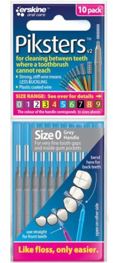 Profesjonalne szczoteczki międzyzębowe Piksters pomagające zachować właściwą higienę jamy ustnej. Mały rozmiar i delikatne włosie pomagają w czyszczeniu trudno dostępnych miejsc np. małych przestrzeni międzyzębowych lub przestrzeni znajdującymi się między gumkami i drutami aparatu ortodontycznego. Szczoteczki posiadają sztywny trzpień z okrągłym, łagodnie zakończonym końcem, który zapobiega uszkodzeniu dziąseł podczas czyszczenia zębów.