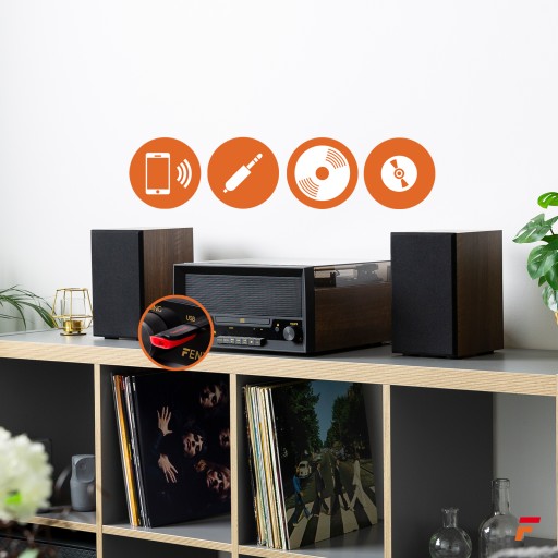 Wbudowany odtwarzacz CD gramofonu zapewnia, że nadal możesz odtwarzać swoje płyty. Czy masz dużo muzyki w postaci cyfrowej jako mp3? Umieść go na pamięci USB i pozwól wewnętrznemu odtwarzaczowi MP3 odtwarzać muzykę bezpośrednio z pamięci USB. Możliwe jest również wykorzystanie odtwarzacza MP3 do nagrywania. W ten sposób możesz łatwo i szybko przekonwertować swoje nagrania na MP3.