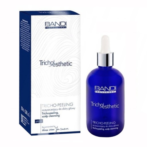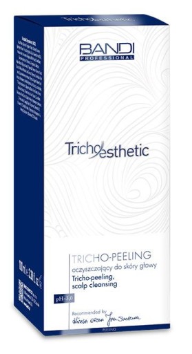 Professional - Tricho Esthetic Scalp Cleansing marki BANDI. Peeling do skóry głowy. Pochodzi z serii Tricho Esthetic, będącą pierwszą polską profesjonalną linią preparatów trychologicznych. Swoje działanie opiera na bazie mocznika, kwasu mlekowego, mięty pieprzowej, alantoiny oraz estrów oliwy z oliwek. Delikatnie zmiękcza naskórek i ułatwia jego łatwe, fizjologiczne złuszczanie. Skutecznie usuwa nadmiar warstwy rogowej naskórka oraz zanieczyszczenia wewnątrz, sprawiając, że skóra staje się oczyszczona i odświeżona, zaś następnie nałożone produkty lepiej się wchłaniają i działają. Peeling dostępny jest o pojemności 100 ml.