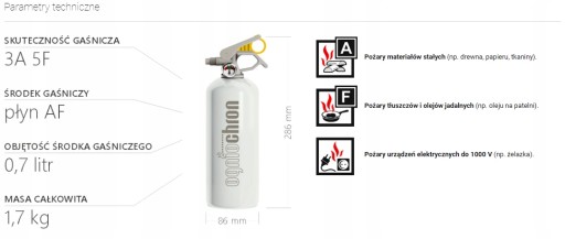 - ⭐️ Mały ciężar (1,7 kg), uniwersalność środka gaśniczego (płyn AF) oraz prostota działania umożliwiają użycie urządzenia przez osoby dorosłe bez specjalnego przeszkolenia.