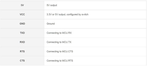 - Wyprowadzone sygnały na złącze goldpin: TX, RX, RTS, CTS, GND, VCC