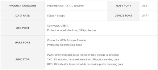 Moduł może być wykorzystany do wymiany danych między komputerem a urządzenie wyposażonym w port UART, np: systemy mikrokontrolerowe, moduły GSM, GPS lub do programowania płytek z wyprowadzonym interfejsem szeregowym, np. Arduino lub STM32Discovery. Konwerter po zainstalowaniu sterowników, w systemie operacyjnym widoczny jako wirtualny port COM. Posiada 3 diody LED informujące o zasilaniu, wysyłaniu oraz odbieraniu danych.