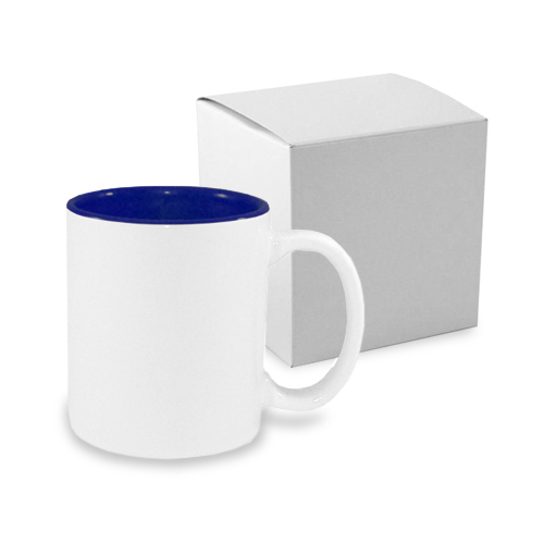 Biały kubek ceramiczny z granatowym wnętrzem, klasy ECO powlekany warstwą poliestru do wykonywania nadruków w technologii sublimacji z kartonikiem. Możliwość zakupu od jednej sztuki.
