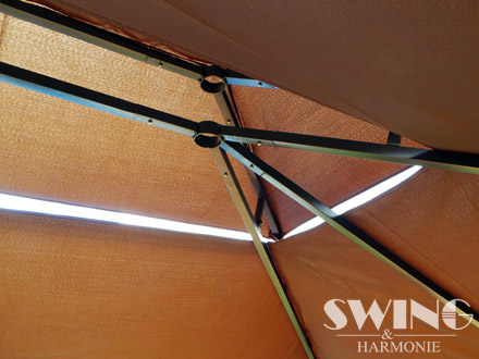 Pawilon posiada również oświetlenie LED, składające się z 60 diod LED, które można włączać i wyłączać ręcznie. Wbudowany akumulator jest ładowany przez moduł słoneczny, który jest już ładowany w ciągu dnia.