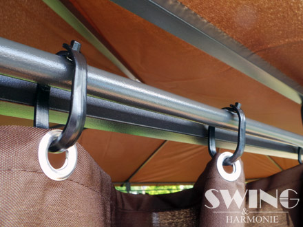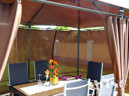 Dzięki bocznym ścianom zapinanym na zamek błyskawiczny nie straszny będzie nam wiatr oraz deszcz . Pawilon ma designerskie ornamenty co nadaje pawilonowi niepowtarzalny urok .