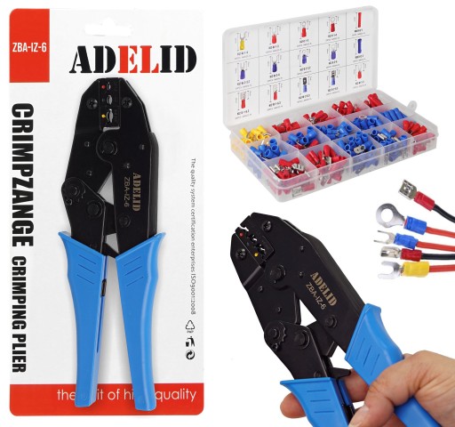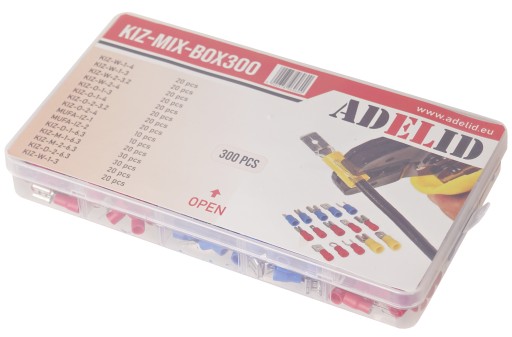 ZESTAW KONEKTORÓW, KOŃCÓWEK IZOLOWANYCH, 300 SZT., W ORGANIZERZE, WRAZ Z PRASKĄ BASIC, MARKI ADELID.