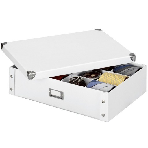 Praktyczny pojemnik do przechowywania drobnych części garderoby: krawatów, pasków, apaszek lub biżuterii. Zawiera 12 przegródek umożliwiających segregację. Otwierana od góry pokrywa pozwala na wygodny i łatwy dostęp do trzymanych wewnątrz rzeczy. Ponadto chroni zawartość przed zakurzeniem. Wykonany z wytrzymałego papieru, brzegi wzmacniane metalowymi obiciami.