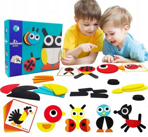 Zestaw drewnianych elementów o różnych kształtach z których można ułożyć różne zwierzątka i figury!
