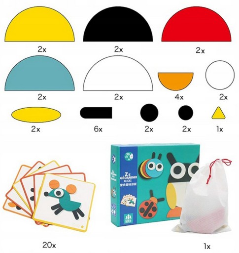 Elementy są duże, wykonane z litego drewna w pięknych kolorach, dla ułatwienia w zestawie znajduje się 20 kart z propozycjami do ułożenia w trzech stopniach trudności.
