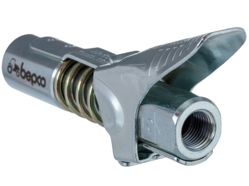 Samoblokująca końcówka smarownicy Bepco Coupler pasująca do wszystkich powszechnie stosowanych smarownic: ręcznych, pneumatycznych i elektrycznych (akumulatorowych), zgodnych ze specyfikacją DIN.