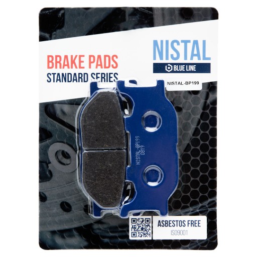 Klocki hamulcowe marki NISTAL to bezpieczny i trwały produkt posiadający doskonały stosunek jakości do ceny. Okładzina to organiczny materiał cierny wzbogacony dodatkami poprawiającymi hamowanie. Klocki z niebieskiej serii BLUE LINE dzięki zawartości 20% miedzi, zapewniają dobre odprowadzanie ciepła, nie szarpią i nie piszczą podczas hamowania. Zapewniają łagodne zużywanie się tarczy. Sprawdzą się również w cięższych motocyklach do rekreacyjnej jazdy. Wytwarzane zgodnie z certyfikatami: ISO 9001:2008, ISO 14001:2004, OHSAS 18001:2007.