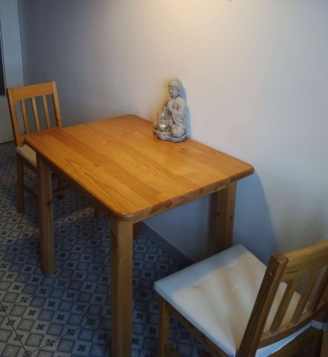 Stół jest wykonany w całości z litego drewna sosnowego.