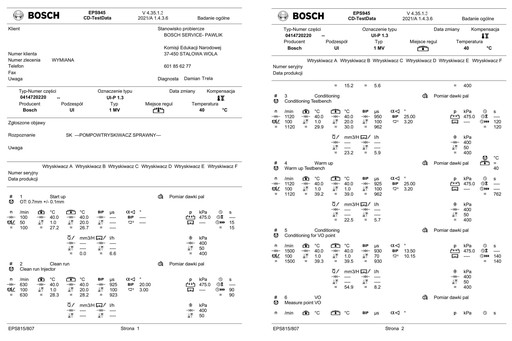 - wydruk parametrów (protokół) ze stołu probierczego firmy Bosch EPS 815 z przystawką CAMBOX