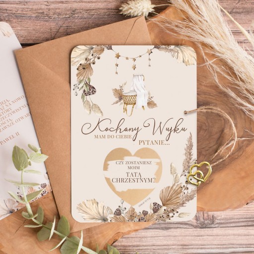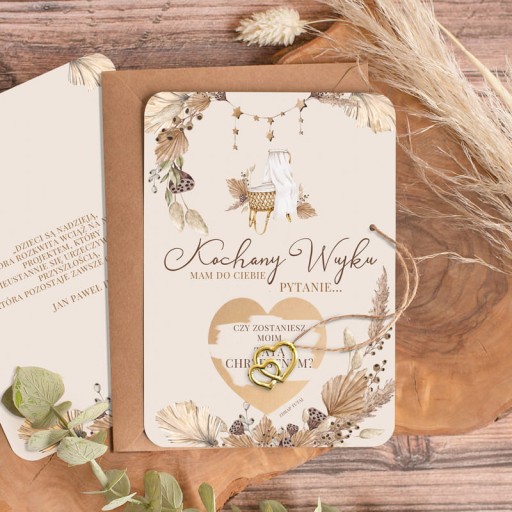 - Oryginalna forma pytania do bliskiej osoby, o bycie chrzestnym. Całość zachowana jest w stylu boho.