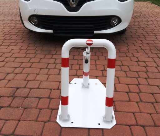 Blokada parkingowa "Słoń", mocna i masywna blokada zamykana na kłódkę. Na tej aukcji blokada parkingowa dostępna w kolorze biało-czerwony. Blokady parkingowe malowane są podkładem cynkowym a następnie lakierowane proszkowo. Całość wykończona poprzez oklejenie folia odblaskową I generacji firmy "Oracal" w kolorze czerwonym. Na innej naszej akcji blokada dostępna w kolorze czarno-żółtym.
