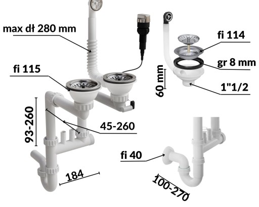 - długość rury przelewu max 280 mm