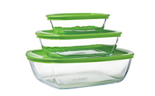 Kolekcja Cook & Store wielofunkcyjnych naczyń szklanych z plastikowymi pokrywami, dostępnych w różnych kształtach i rozmiarach. Naczynia doskonale nadają się do pieczenia (bez pokrywek), podgrzewania w kuchenkach mikrofalowych, przechowywania i zamrażania żywności. Zakres temperatury od -40°C do +300°C.