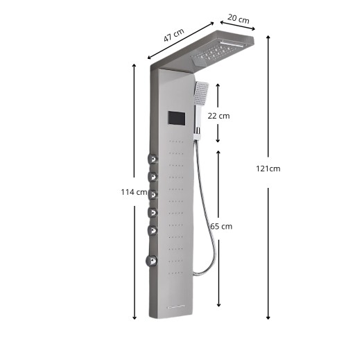 Panel z deszczownicą i hydromasażem zawiera wszystkie niezbędne elementy do montażu w Waszej łazience, pokoju kąpielowym czy prywatnym SPA.