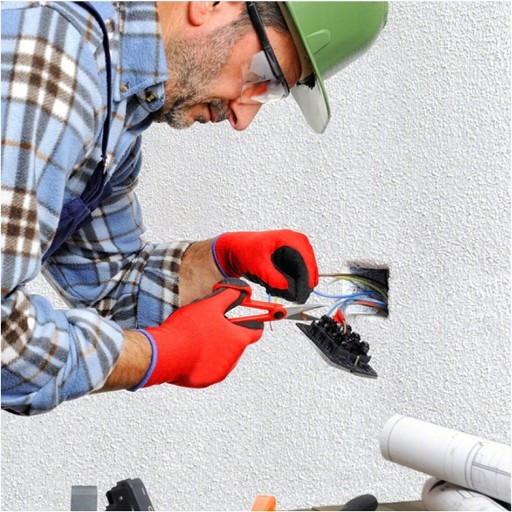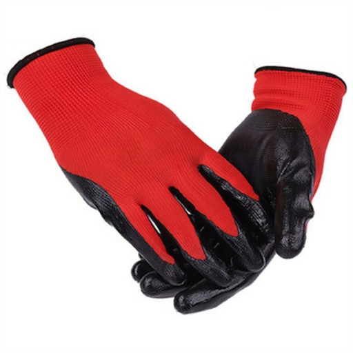 Rękawice robocze ochronne, wykonane z dzianiny poliestrowej w kolorze czerwonym, powlekane lateksem w kolorze czarnym, bezszwowe, zakończone ściągaczem NYLATEX - 10 PAR