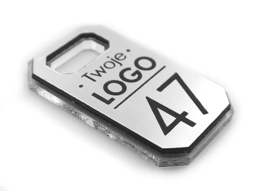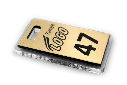 - Brelok wykonujemy techniką grawerowania laserowego na wysokiej jakości laminacie grawerskim o grubości 1,6mm, przyklejonej do pleksi grubości 3 mm z dwóch stron.