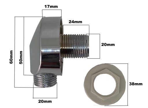 Kolanko do węża prysznicowego kabiny z hydromasażem. Wykonane z tworzywa sztucznego, wykończone chromem - połysk. Szczegółowe wymiary na zdjęciach.