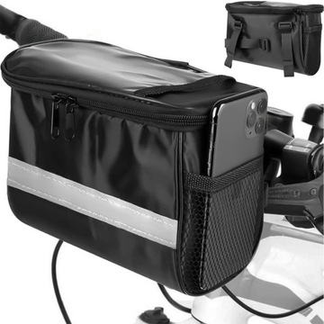 Wielofunkcyjna torba rowerowa zaczepiana na kierownicę. Idealne sprawdzi się jako schowek podczas podróży, posiada aż 4 różnej wielkości schowki.