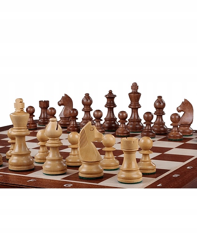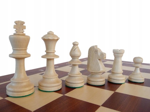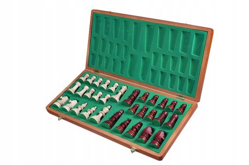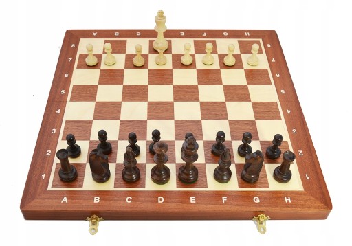 Szachy wykonane z drewna grabowego, obciążane metalem. Kaseta intarsjowana mahoniowo-jaworowa.