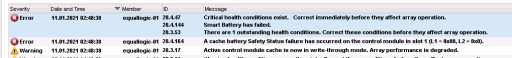 Usterka powoduje wyłączenie pamięci cache na macierzy, co skutkuje drastycznym spadkiem wydajności I/O.