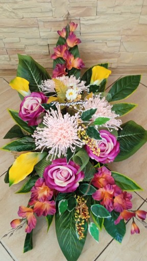 Kompozycja sztuczna (tzw. stroik, ikebana) jest wykonana z sztucznej choiny w doniczce plastikowej co daje jej stabilność.