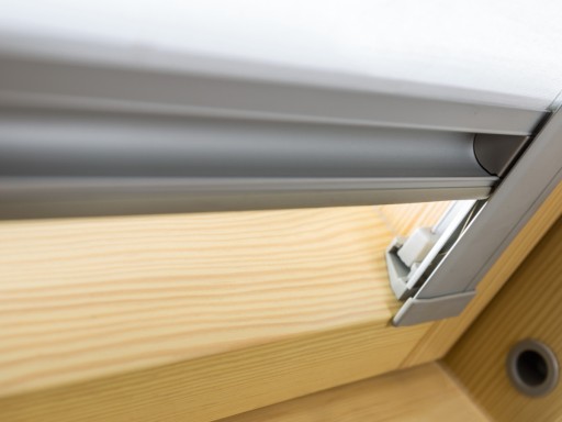 Zaciągnięta na oknie dachowym zasłania ostre światło słoneczne.
