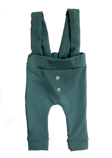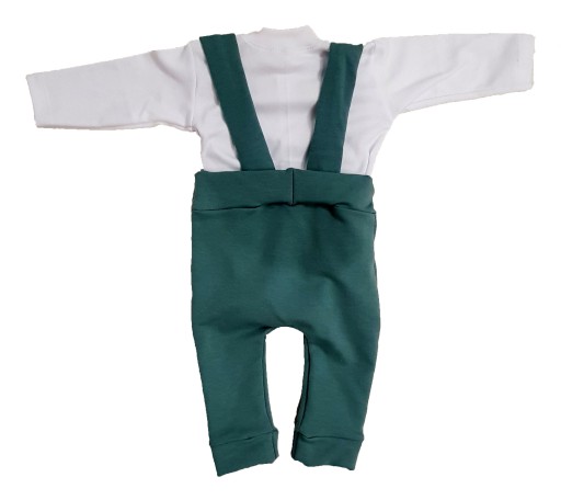 Zestaw składa się z białych bodziaków z guziczkami oraz muszką + zielone spodnie z guziczkami i odpinanymi szelkami - całość zestawu tworzy eleganckie ubranko dla waszym małych pociech - rozmiar 62