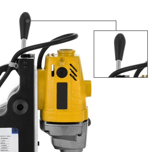 Przemyślany projekt i system chłodzenia: Ten ergonomiczny uchwyt zapewnia wygodny chwyt podczas pracy i transportu. Te 3 przedłużone korby są pokryte antypoślizgową gumą, co zapewnia oszczędność pracy. Zbiornik chłodziwa, pyłoszczelny wlot powietrza oraz otwory wylotowe powietrza służą do chłodzenia wiertarki magnetycznej podczas przegrzania.