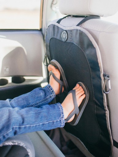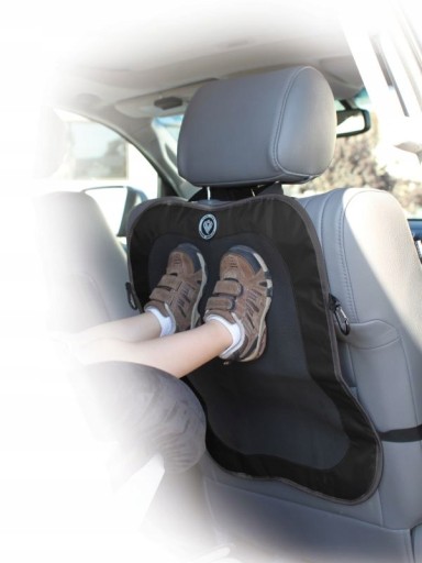 Praktyczna mata do ochrony tylej części siedzenia samochodowego przed zabrudzeniem. Po bokach mata ma dwa praktyczne zaczepy, na których można przymocować zabawki.