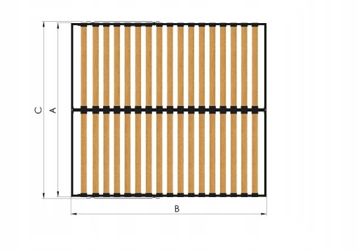 Odległość między listwami ok. 50 mm. Udźwig pod typowy materac do spania dla dwóch osób. Całkowita wysokość wraz z podnośnikiem ok. 16 cm.