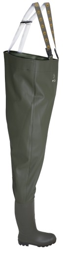 Spodniobuty wodoochronne z wgrzanymi na stałe wysokiej jakości kaloszami. Posiadają regulowane szelki z elastycznej, szerokiej gumy. Model produkowany z wodoochronnej, wytrzymałej tkaniny Plavitex Heavy Duty. Przeznaczony szczególnie dla wędkarzy i rybaków do użytku przy wszelkich pracach rybackich. Zapewniają skuteczną ochronę przed wodą. Technika obustronnego zgrzewania zwiększa wytrzymałość szwów.