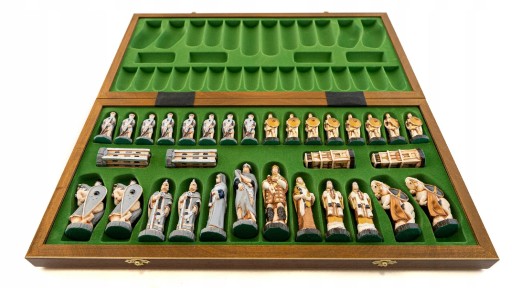 Szachy wykonane z mielonego marmuru, ręcznie malowane.. Kaseta intarsjowana mahoniowo-jaworowa.