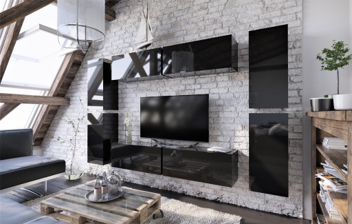 Nowoczesna meblościanka do salonu to połączenie prostych kszałtów z szykownym połyskiem. Front w czarnym połysku wykonany z płyty MDF membrana, natomiast korpus czarny mat z płyty wiórowej 16 mm.